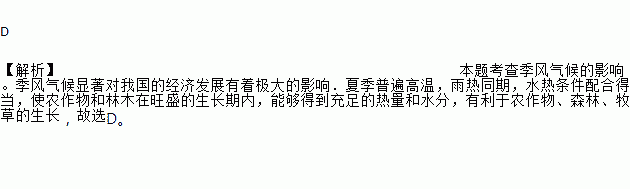 D ¡¾½âÎö¡¿±¾Ì⿼²é¼¾·çÆøºòµÄÓ°Ïì¡£¼¾·çÆøºòÏÔÖø¶ÔÎÒ¹úµÄ¾­¼Ã·¢Õ¹ÓÐ׿«´óµÄÓ°Ï죮Ïᆵձé¸ßΣ¬ÓêÈÈͬÆÚ£¬Ë®ÈÈÌõ¼þÅäºÏµÃµ±£¬Ê¹Å©×÷ÎïºÍÁÖľÔÚÍúÊ¢µÄÉú³¤ÆÚÄÚ£¬Äܹ»µÃµ½³ä×ãµÄÈÈÁ¿ºÍË®·Ö£¬ÓÐÀûÓÚÅ©×÷ÎɭÁÖ¡¢ÄÁ²ÝµÄÉú³¤£¬¹ÊÑ¡D¡£