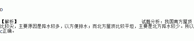 D 【解析】试题分析:我国南方屋顶比较尖,主要原因是降水较多,以方便排水;而北方屋顶比较平坦,主要是北方降水较少。所以C正确。