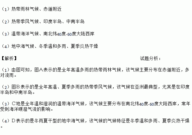 (1)热带雨林气候、赤道附近 (2)热带季风气候、印度半岛、中南半岛 (3)温带海洋气候、南北纬40度-60度大陆西岸 (4)地中海气候、冬季温和多雨、夏季炎热干燥 【解析】试题分析: (1)由图可知,图A表示的是全年高温多雨的热带雨林气候,该气候主要分布在赤道附近,多对流雨。 (2)图B表示的是全年高温、夏季多雨的热带季风气候,该气候在亚洲最典型,尤其是在印度...