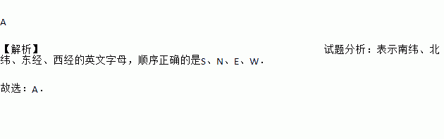 A 【解析】试题分析:表示南纬、北纬、东经、西经的英文字母,顺序正确的是S、N、E、W. 故选:A.