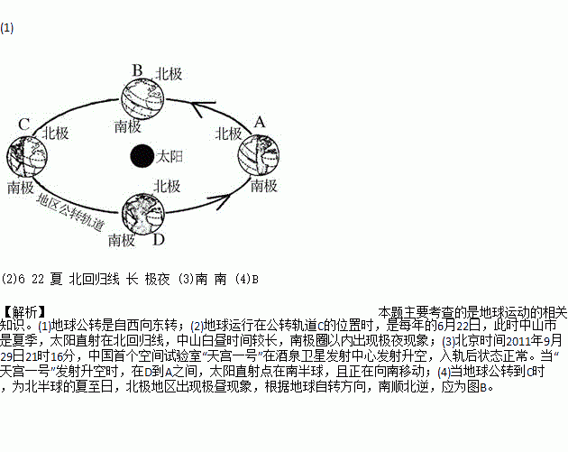 (2)地球运行在公转轨道C的位置时,是每年的________月________日,此时中山市是________季(季节)。太阳直射在________,中山白昼时间较________(选填“长”或“短”),南极圈以内出现________(选填“极昼”或“极夜”)现象。