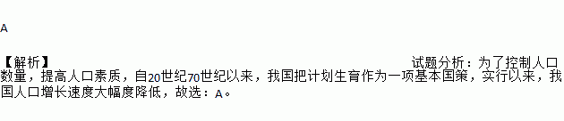A 【解析】试题分析:为了控制人口数量,提高人口素质,自20世纪70世纪以来,我国把计划生育作为一项基本国策,实行以来,我国人口增长速度大幅度降低,故选:A。