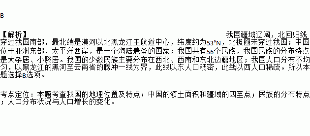 B ¡¾½âÎö¡¿ÎÒ¹ú½®ÓòÁÉÀ«£¬±±»Ø¹éÏß´©¹ýÎÒ¹úÄϲ¿£¬×î±±¶ËÊÇÄ®ºÓÒÔ±±ºÚÁú½Ö÷º½µÀÖÐÐÄ£¬Î³¶ÈԼΪ53¡ãN£¬±±¼«È¦Î´´©¹ýÎÒ¹ú£»ÖйúλÓÚÑÇÖÞ¶«²¿¡¢Ì«Æ½ÑóÎ÷°¶£¬ÊÇÒ»¸öº£Â½¼æ±¸µÄ¹ú¼Ò£»ÎÒ¹ú¹²ÓÐ56¸öÃñ×壬ÎÒ¹úÃñ×åµÄ·Ö²¼ÌصãÊÇ´óÔÓ¾Ó¡¢Ð¡¾Û¾Ó¡£ÎÒ¹úµÄÉÙÊýÃñ×åÖ÷Òª·Ö²¼ÔÚÎ÷±±¡¢Î÷ÄϺͶ«±±±ß½®µØÇø£»ÎÒ¹úÈ˿ڷֲ¼²»¾ùÔÈ£¬ÒÔºÚÁú½µÄºÚºÓÖÁÔÆÄÏÊ¡µÄÌÚ³åÒ»ÏßΪ½ç£¬´ËÏßÒÔ¶«È˿ڳíÃÜ£¬´ËÏßÒÔÎ÷ÈË¿ÚÏ¡Êè¡£ËùÒÔ±¾ÌâÑ¡ÔñBÑ¡Ïî¡£ ...