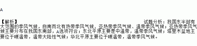 A 【解析】试题分析:我国东半部有大范围的季风气候,自南而北有热带季风气候、亚热带季风气候、温带季风气候;亚热带季风气候主要分布在我国东南部,A选项符合;东北平原主要是中温带,温带季风气候;塔里木盆地主要位于暖温带,温带大陆性气候;华北平原主要位于暖温带,温带季风气候。