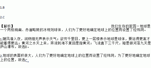 1.B 2.C 【解析】 我们生存的家园-地球是一个两极稍扁、赤道略鼓的冰规则球体,人们为了更好地确定地球上的位置而设置了经纬网。 1.随风潜入夜,润物细无声表示天气;欲穷千里目,更上一层楼表示地球是球体,要站得更高才能看得更远;黄河之水天上来,奔流到海不复回是指黄河;飞流直下三千尺,疑是银河落九天是庐山瀑布,故选B。 2.地球的表面积很大,人们为了更好地确定地球上的位置而...