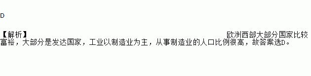 D 【解析】欧洲西部大部分国家比较富裕,大部分是发达国家,工业以制造业为主,从事制造业的人口比例很高,故答案选D。