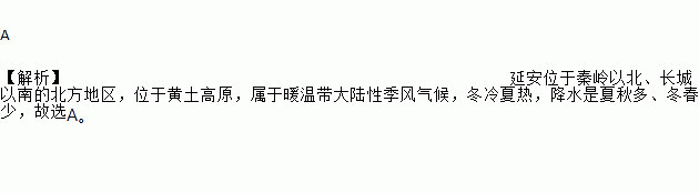 A 【解析】延安位于秦岭以北、长城以南的北方地区,位于黄土高原,属于暖温带大陆性季风气候,冬冷夏热,降水是夏秋多、冬春少,故选A。