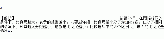 A 【解析】试题分析:在图幅相同的条件下,比例尺越大,表示的范围越小,内容越详细.比例尺是个分子为1的分数,在分子相同的情况下,分母越大分数越小,也就是比例尺越小;比较选项中的四个比例尺,最大的比例尺是选项A.