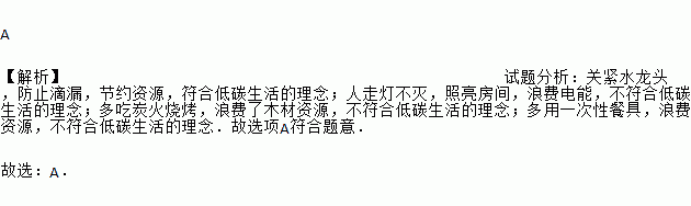 A ¡¾½âÎö¡¿ÊÔÌâ·ÖÎö£º¹Ø½ôË®ÁúÍ·£¬·ÀÖ¹µÎ©£¬½ÚÔ¼×ÊÔ´£¬·ûºÏµÍ̼Éú»îµÄÀíÄÈË×ߵƲ»Ãð£¬ÕÕÁÁ·¿¼ä£¬À˷ѵçÄÜ£¬²»·ûºÏµÍ̼Éú»îµÄÀíÄ¶à³ÔÌ¿»ðÉÕ¿¾£¬ÀË·ÑÁËľ²Ä×ÊÔ´£¬²»·ûºÏµÍ̼Éú»îµÄÀíÄ¶àÓÃÒ»´ÎÐԲ;ߣ¬ÀË·Ñ×ÊÔ´£¬²»·ûºÏµÍ̼Éú»îµÄÀíÄ¹ÊÑ¡ÏîA·ûºÏÌâÒ⣮ ¹ÊÑ¡£ºA£®