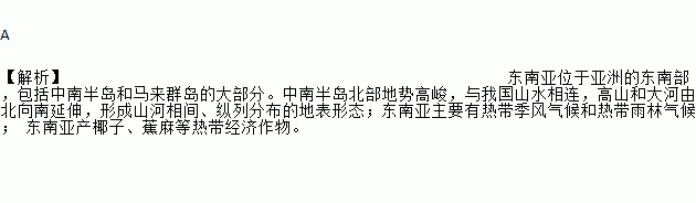 A ¡¾½âÎö¡¿¶«ÄÏÑÇλÓÚÑÇÖ޵Ķ«Äϲ¿£¬°üÀ¨ÖÐÄϰ뵺ºÍÂíÀ´ÈºµºµÄ´ó²¿·Ö¡£ÖÐÄϰ뵺±±²¿µØÊƸ߾þ£¬ÓëÎÒ¹úɽˮÏàÁ¬£¬¸ßɽºÍ´óºÓÓɱ±ÏòÄÏÑÓÉ죬ÐγÉɽºÓÏà¼ä¡¢×ÝÁзֲ¼µÄµØ±íÐÎ̬£»¶«ÄÏÑÇÖ÷ÒªÓÐÈÈ´ø¼¾·çÆøºòºÍÈÈ´øÓêÁÖÆøºò£» ¶«ÄÏÑDzúÒ¬×Ó¡¢½¶ÂéµÈÈÈ´ø¾¼Ã×÷Îï¡£