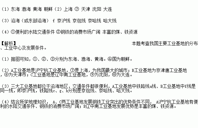 (3)A、B、C三大工业基地工业发展的共同条件是:一是优越的地理位置即分布在______地区;二是便利的交通条件: