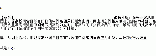 C ¡¾½âÎö¡¿ÊÔÌâ·ÖÎö£ºÔڵȸßÏßµØÐÎͼÉÏ£¬µÈ¸ßÏß±ÕºÏÇҵȸßÏßÊýÖµÖмä¸ßËÄÖܵÍÔòΪɽ¶¥£»Á½É½¶¥Ö®¼äÏà¶ÔµÍÍݵIJ¿Î»Îª°°²¿£»¸ßÏß±ÕºÏÇҵȸßÏßÊýÖµÖмäµÍËÄÖܸßÔòΪÅèµØ£»µÈ¸ßÏßÏòº£°ÎµÍ´¦Í¹ÎªÉ½¼¹£»µÈ¸ßÏßÏòº£°Î¸ß³ö͹Ϊɽ¹È£»¼¸Ìõº£°Î²»Í¬µÄµÈ¸ßÏßÖØºÏ´¦Îª¶¸Ñ£® ¡¾½âÎö¡¿ ´ÓͼÉÏ¿´³ö£¬¼×µØµÈ¸ßÏß±ÕºÏÇҵȸßÏßÊýÖµÖмä¸ßËÄÖܵÍӦΪɽ¶¥£®¹ÊÑ¡ÏîC·ûºÏÌâÒ⣮ ¹ÊÑ¡£ºC£®
