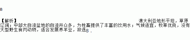 B 【解析】澳大利亚地形平坦,草原辽阔;中部大自流盆地的自流井众多,为牲畜提供了丰富的饮用水;气候适宜,牧草优良,没有大型野生食肉动物,适合发展养羊业,故选B.