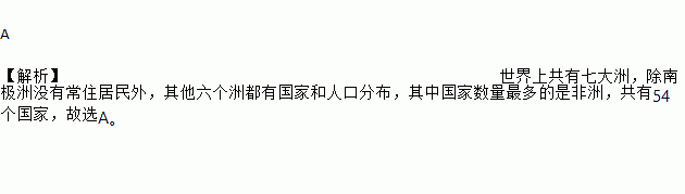 A 【解析】世界上共有七大洲,除南极洲没有常住居民外,其他六个洲都有国家和人口分布,其中国家数量最多的是非洲,共有54个国家,故选A。