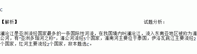 C 【解析】试题分析: 澜沧江是亚洲流经国家最多的一条国际性河流,在我国境内叫澜沧江,流入东南亚地区被称为湄公河,有“亚洲多瑙河之称”,湄公河流经5个国家,湄南河主要位于泰国,伊洛瓦底江主要流经2个国家,红河主要流经2个国家,故本题选C。