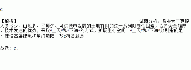C 【解析】试题分析:香港为了克服人多地少、山地多、平原少、可供城市发展的土地有限的这一系列限制性因素,发挥资金雄厚、技术发达的优势,采取“上天“和“下海“的方式,扩展生存空间.“上天”和“下海”分别指的是:建设高层建筑和填海造陆.故C符合题意. 故选:C.