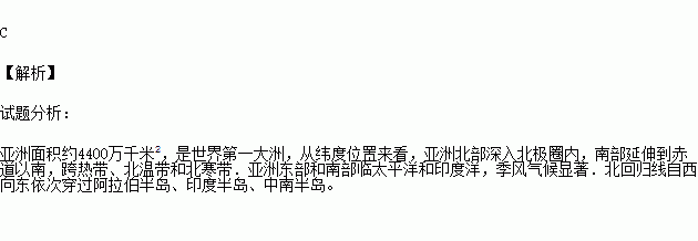 读亚洲略图判断,下列关于亚洲的说法错误的是()