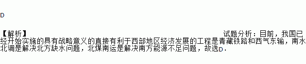 D 【解析】试题分析:目前,我国已经开始实施的具有战略意义的直接有利于西部地区经济发展的工程是青藏铁路和西气东输,南水北调是解决北方缺水问题,北煤南运是解决南方能源不足问题,故选D.