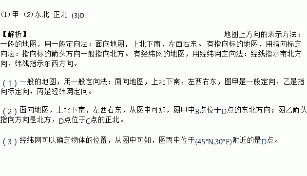 (1)甲 (2)东北 正北 (3)D 【解析】地图上方向的表示方法:一般的地图,用一般定向法:面向地图,上北下南,左西右东。有指向标的地图,用指向标定向法:指向标的箭头方向一般指向北方。有经纬网的地图,用经纬网定向法:经线指示南北方向,纬线指示东西方向。 (1)一般的地图,用一般定向法:面向地图,上北下南,左西右东,图甲是一般定向,乙是指向标定向,丙是经纬网定向。 (2)面...