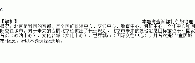 C ¡¾½âÎö¡¿±¾Ì⿼²éÊ×¶¼±±¾©µÄµØÀí¸Å¿ö¡£±±¾©ÊÇÎÒ¹úµÄÊ×¶¼£¬ÊÇÈ«¹úµÄÕþÖÎÖÐÐÄ¡¢½»Í¨ÖÐÐÄ¡¢½ÌÓýÖÐÐÄ¡¢¿ÆÑÐÖÐÐÄ¡¢ÎÄ»¯ÖÐÐĺ͹ú¼Ê½»Íù³ÇÊУ¬¶ÔÓÚδÀ´µÄ·¢Õ¹±±¾©Ò²×ö³öÁ˳¤Ô¶¹æ»®£¬±±¾©ÊÐδÀ´µÄ½¨É跢չĿ±ê¶¨Î»ÓÚ£º¹ú¼ÒÊ×¶¼£¨ÕþÖÎÖÐÐÄ£©¡¢ÎÄ»¯Ãû³Ç£¨ÎÄ»¯ÖÐÐÄ£©¡¢ÊÀ½ç³ÇÊУ¨¹ú¼Ê½»ÍùÖÐÐÄ£©£¬²¢Ê×´ÎÌá³ö¡°Ò˾ӳÇÊС±¸ÅÄî¡£ËùÒÔ±¾ÌâÑ¡ÔñCÑ¡Ïî¡£