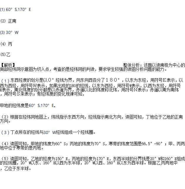 (5)乙.丙两地中,位于东半球是________.