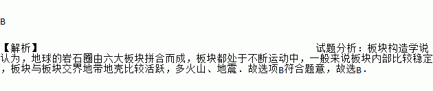B 【解析】试题分析:板块构造学说认为,地球的岩石圈由六大板块拼合而成,板块都处于不断运动中,一般来说板块内部比较稳定,板块与板块交界地带地壳比较活跃,多火山、地震.故选项B符合题意,故选B.