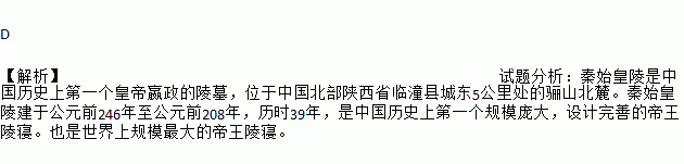 D 【解析】试题分析:秦始皇陵是中国历史上第一个皇帝嬴政的陵墓,位于中国北部陕西省临潼县城东5公里处的骊山北麓。秦始皇陵建于公元前246年至公元前208年,历时39年,是中国历史上第一个规模庞大,设计完善的帝王陵寝。也是世界上规模最大的帝王陵寝。