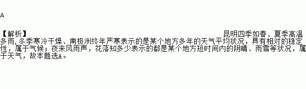 A ¡¾½âÎö¡¿À¥Ã÷Ëļ¾Èç´º¡¢ÏマßζàÓê,¶¬¼¾º®Àä¸ÉÔï¡¢Äϼ«ÖÞÖÕÄêÑϺ®±íʾµÄÊÇij¸öµØ·½¶àÄêµÄÌìÆøÆ½¾ù×´¿ö£¬¾ßÓÐÏà¶ÔµÄÎȶ¨ÐÔ£¬ÊôÓÚÆøºò£»Ò¹À´·çÓêÉù£¬»¨ÂäÖª¶àÉÙ±íʾµÄ¶¼ÊÇij¸öµØ·½¶Ìʱ¼äÄÚµÄÒõÇç¡¢ÓêÑ©µÈ×´¿ö£¬ÊôÓÚÌìÆø£¬¹Ê±¾ÌâÑ¡A¡£