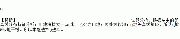 D 【解析】试题分析:根据图中的等高线分布特征分析:甲地海拔大于240米;乙处为山地;丙处为鞍部;Q地等高线稀疏,所以Q坡较P地平缓。所以本题选择D选项。