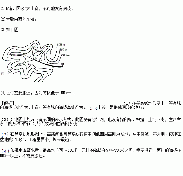(4)如果水库蓄水后,最高水位可达550米(海拔),为了不被淹没,乙、丙两村庄需要搬迁吗?请说明理由。