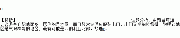 D ¡¾½âÎö¡¿ÊÔÌâ·ÖÎö£ºÓÉÌâÄ¿¿ÉÖª£¬¸ÃÓοͽéÉÜËû¼ÒÏ磬¾ÓסµÄÊÇľÎÝ£¬¶øÇÒ¾³£´©Ã«Æ¤·þ×°³öÃÅ£¬³öÃÅÓÖ×ø¹·ÀÑ©ÇÁ£¬ËµÃ÷¸ÃµØÇøÊÇÆøºòº®ÀäµÄµØÇø£¬×îÓпÉÄÜÊÇÎ÷²®ÀûÑDZ±²¿£¬¹ÊÑ¡D£®