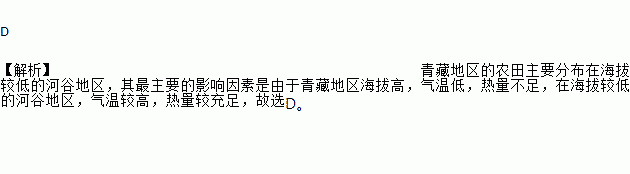 D 【解析】青藏地区的农田主要分布在海拔较低的河谷地区,其最主要的影响因素是由于青藏地区海拔高,气温低,热量不足,在海拔较低的河谷地区,气温较高,热量较充足,故选D。