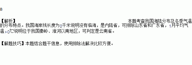 下列省区符合条件:海岸线长度为0千米,1月平均气温>0 ℃的是( )