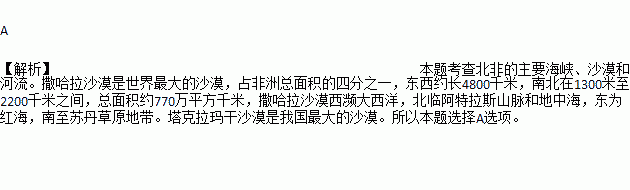 A. 撒哈拉沙漠 B. 塔克拉玛干沙漠 C. 鲁卜哈利沙漠 D. 印度沙漠