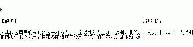 B 【解析】试题分析: 大陆和它周围的岛屿合起来称为大洲,全球共分为亚洲、欧洲、北美洲、南美洲、非洲、大洋洲和南极洲七个大洲。直布罗陀海峡是欧洲与非洲的分界线,故本题选B。
