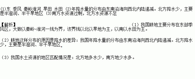 (1)我国耕地主要分布在__________部__________区。大致以_______________一线为界,以北以___________(耕地)为主,以南以____________(耕地)为主。