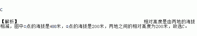 C 【解析】相对高度是由两地的海拔相减,图中①点的海拔是400米,②点的海拔是200米,两地之间的相对高度为200米,故选C。