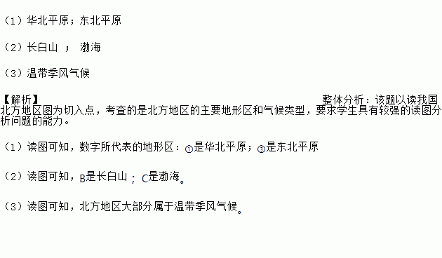 (1)华北平原;东北平原 (2)长白山 ; 渤海 (3)温带季风气候 【解析】整体分析:该题以读我国北方地区图为切入点,考查的是北方地区的主要地形区和气候类型,要求学生具有较强的读图分析问题的能力。 (1)读图可知,数字所代表的地形区:①是华北平原;③是东北平原 (2)读图可知,B是长白山; C是渤海。 (3)读图可知,北方地区大部分属于温带季风气候。 ...