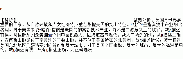 B ¡¾½âÎö¡¿ÊÔÌâ·ÖÎö£ºÃÀ¹úÊÇÊÀ½ç×îÖØÒªµÄ¹ú¼Ò¡£´Ó×ÔÈ»»·¾³ºÍÈËÎľ¼ÃÌØµãÖØµãÕÆÎÕÃÀ¹úµÄÍ»³öÌØÕ÷¡£¡°¹è¹È¡±ÊÇÖ¸¸ß¼¼Êõ²úÒµµÄ´úÃû´Ê¡£¶ÔÓÚÃÀ¹úÀ´Ëµ¡°¹è¹È¡±Ö¸µÄÊÇÃÀ¹úµÄµÄ¸ßм¼Êõ²úÒµ£¬²¢²»ÊÇ×ÔÈ»ÒâÒåÉϵÄÏ¿¹È£¬¹ÊAÃèÊöÓÐÎó¡£°¢À˹¼ÓÖÝÊÇÃÀ¹ú50¸öÖÝÖÐÃæ»ý×î´ó£¬Òòγ¶È¸ßÆøÎµͣ¬¹ÊÈË¿ÚÏ¡ÉÙµÄÖÝ£¬¹ÊBÃèÊöÕýÈ·¡£°²µÚ˹ɽÂöÊÇλÓÚÄÏÃÀÖÞµÄÖ÷ҪɽÂö£¬²¢²»Î»ÓÚÃÀ¹úËùÔڵı±ÃÀÖÞ£¬¹ÊCÃèÊö´íÎó¡£²¨Ê¿¶ÙÊÇÃÀ¹ú¶«±±µØÇøÂíÈøÖî...