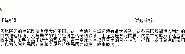C ¡¾½âÎö¡¿ÊÔÌâ·ÖÎö£º ¸÷µØÃñ¾ÓµÄ½¨Öþ·ç¸ñÓкܴóµÄ²»Í¬£¬ÕâÓëµ±µØµÄ×ÔÈ»»·¾³Óкܴó¹ØÏµ£¬ÕâЩÃñ¾Ó¼ÈÄÜÊÊÓ¦µ±µØµÄ×ÔÈ»µØÀí»·¾³£¬ÓÖÓë¾ÓÃñµÄÉç»á¾¼ÃÉú»îÃÜÇÐÁªÏµ¡£ÍÁÅ÷·¿ÊǶ«±±Ãñ¾Ó£»ÄÚÃɹŸßÔΪÁËÊÊÓ¦ÓÎÄÁÉú»î£¬·¢Ã÷ÁËÒ×ÓÚ²ðǨµÄÃɹŰü£»»ÆÍÁ¸ßÔµØÇø¸ù¾Ý»ÆÍÁµÄÖ±Á¢ÐÔÖÊ£¬ÍÚ¾òÁ˶¬Å¯ÏÄÁ¹µÄÒ¤¶´£¬×÷Ϊ´«Í³µÄÃñ¾Ó£»Çà²Ø¸ßԵĴ«Í³Ãñ¾ÓΪµï·¿£¬¹Ê±¾ÌâÑ¡C¡£