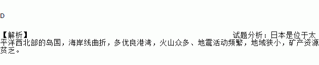 D 【解析】试题分析:日本是位于太平洋西北部的岛国,海岸线曲折,多优良港湾,火山众多、地震活动频繁,地域狭小,矿产资源贫乏。