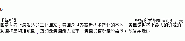 D 【解析】根据所学的知识可知,美国是世界上最发达的工业国家;美国是世界高新技术产业的基地;美国是世界上最大的资源消耗国和废物排放国;纽约是美国最大城市,美国的首都是华盛顿;故答案选D。