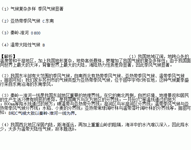 (3) B和C气候大致以 一线为界,该界线大致和冬季 ℃等温线一致,又是我国年降水量 毫米经过的地方。