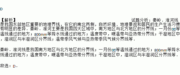 D ¡¾½âÎö¡¿ÊÔÌâ·ÖÎö£ºÇØÁ룮»´ºÓÏßÊÇÎÒ¹ú¶«²¿µØÇøÖØÒªµÄµØÀí½çÏߣ¬ÔÚËüµÄÄϱ±Á½²à£¬×ÔÈ»»·¾³£®µØÀí¾°¹ÛºÍ¾ÓÃñµÄÉú²úÉú»îϰ¹ßÓÐÃ÷ÏԵIJîÒì£®ÇØÁ룮»´ºÓÖ÷ÒªÊÇÎÒ¹úËÄ´óÇøÓòÖУ¬ÄÏ·½µØÇøÓë±±·½µØÇøµÄ·Ö½çÏߣ»Ò»Ô·Ý0¡æµÈÎÂÏßͨ¹ýµÄµØ·½£»800mmµÈ½µË®Ïßͨ¹ýµÄµØ·½£»Î¶ȴøÖУ¬Å¯Î´øÓëÑÇÈÈ´ø·Ö½çÏߣ»¸ÉʪµØÇøÖУ¬ÊªÈóÇøÓë°ëʪÈóÇø·Ö½çÏߣ»Î´ø¼¾·çÆøºòÓëÑÇÈÈ´ø¼¾·çÆøºò·Ö½çÏߵȣ® ÇØÁ룮»´ºÓÏßÊÇÎÒ¹úÄÏ·½µØÇøÓë±±...