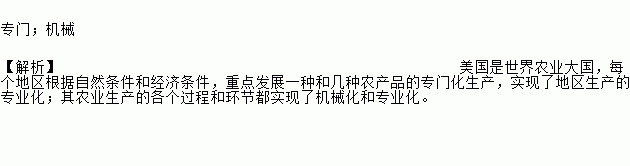 专门;机械 【解析】美国是世界农业大国,每个地区根据自然条件和经济条件,重点发展一种和几种农产品的专门化生产,实现了地区生产的专业化;其农业生产的各个过程和环节都实现了机械化和专业化。
