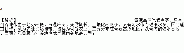 A 【解析】青藏高原气候高寒,只有河谷地带由于地势较低,气温较高,无霜期长,土壤比较肥沃,又有河水作为灌溉水源,因而适宜耕作,成为农业发达地带,被称为河谷农业,主要分布在青藏高原地区,以青海的湟水谷地、西藏的雅鲁藏布江谷地也就是藏南谷地最典型。