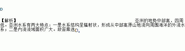 D 【解析】亚洲的地势中部高,四周低。亚洲水系有两大特点:一是水系结构呈辐射状,形成从中部高原山地流向周围海洋的外流水系;二是内流流域面积广大。故答案选D。