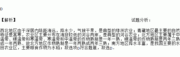 D 【解析】试题分析: 西北地区由于深居内陆距海远,降水少,气候干旱,是典型的绿洲农业;青藏地区最主要的自然特征是高寒,农业区主要分布在海拔较低的河谷两岸,是典型的河谷农业;北方地区主要属于中温带、暖温带和寒温带.寒温带和中温带的作物熟制是一年一熟,暖温带的作物熟制是两年三熟或一年两熟.故北方地区作物熟制是一年两熟或两年三熟;南方地区降水丰富,是我国主要的水田农业区,主要粮食作物为水稻...