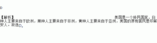 D 【解析】美国是一个移民国家,白种人主要来自于欧洲,黑种人主要来自于非洲,黄种人主要来自于亚洲,美国的原有居民是印第安人。故选D。
