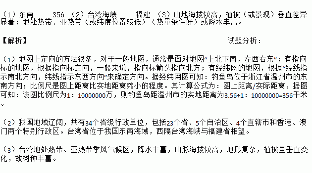 (1)东南 356 (2)台湾海峡 福建 (3)山地海拔较高,植被(或景观)垂直差异显著;地处热带、亚热带(或纬度位置较低)(热量条件好)或降水丰富。 【解析】试题分析: (1)地图上定向的方法很多,对于一般地图,通常是面对地图“上北下南,左西右东”;有指向标的地图,根据指向标定向,一般来说,指向标箭头指向北方;有经纬网的地图,根据“经线指示南北方向,纬线指示东西方向”来确定方...